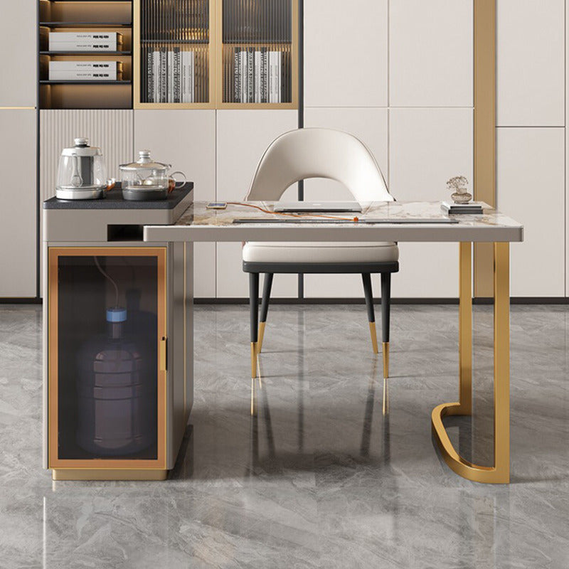 Rectangular Expandable Island Table with Gold Stainless Steel Hardware Design Legs Paired with a Rectangular Cabinet